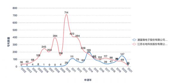 而通富微電起步較晚,直至2004年才開(kāi)始申請(qǐng)專利,后勁力也略顯不足,僅2011年、2014年、2015年、2017年以及2020年專利申請(qǐng)量高于100項(xiàng)。因此,在2002至2013年期間,長(zhǎng)電科技在專利申請(qǐng)量遠(yuǎn)超通富微電,隨后二者專利申請(qǐng)量交替領(lǐng)先。