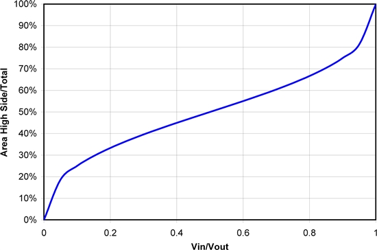 通過圖 1,我們知道 50% 轉(zhuǎn)換比率時出現(xiàn)最佳傳導損耗極值。但是,在其他轉(zhuǎn)換比率條件下,可以將損耗降至這一水平以下。附錄 1 給出了進行這種優(yōu)化的數(shù)學計算方法,而圖 2 顯示了其計算結(jié)果。即使在極低的轉(zhuǎn)換比率條件下,F(xiàn)ET 芯片面積的很大一部分都應該用于高側(cè) FET。高轉(zhuǎn)換比率時同樣如此;應該有很大一部分面積用于低側(cè)。這些結(jié)果是對這一問題的初步研究,其并未包括如高側(cè)和低側(cè)FET之間的各種具體電阻值,開關(guān)速度的影響,或者對這種芯片面積進行封裝相關(guān)的成本和電阻等諸多方面。但是,它為確定 FET 之間的電阻比提供了一個良好的開端,并且應會在FET選擇方面實現(xiàn)更好的整體折中。