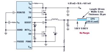 在這些數(shù)字系統(tǒng)中,有很多都使用高電流和低電壓,因此更需要盡可能縮短電源和負(fù)載之間的距離。高電流導(dǎo)致的一個(gè)明顯問(wèn)題是,從轉(zhuǎn)換器到負(fù)載,線(xiàn)路產(chǎn)生的電壓會(huì)不斷下降。圖1和圖2顯示了電源和負(fù)載之間引線(xiàn)電阻的最小化如何使轉(zhuǎn)換器的輸出電壓降最小化——本例中是控制器IC和為CPU供電的MOSFET。