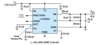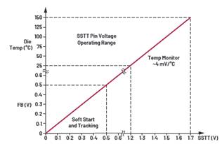 在上述解決方案中,LTC3310S內(nèi)部溫度升幅通過(guò)高效率操作而得以最小化,即使在CPU、SoC和FPGA等高功耗器件周?chē)膼毫訙囟葪l件下,它也能夠可靠地運(yùn)行。此外,LTC3310S內(nèi)置精密溫度傳感器,支持通過(guò)SSTT引腳測(cè)量?jī)?nèi)部結(jié)溫,如圖10所示,相應(yīng)的溫度傳感器特性如圖11所示。