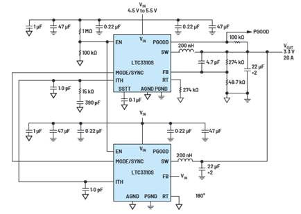 某些單片穩(wěn)壓器可通過(guò)多相并聯(lián)操作擴(kuò)展到更高負(fù)載應(yīng)用。圖12顯示了多個(gè)LTC3310S器件并聯(lián)并錯(cuò)相工作,使得電流能力加倍。