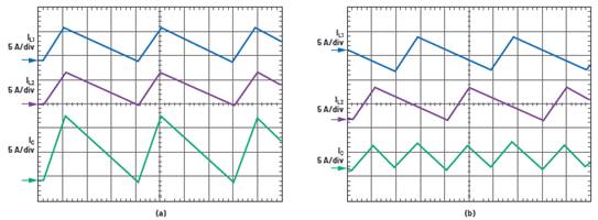 圖13.比較兩個(gè)版本的雙通道轉(zhuǎn)換器的電感電流和輸出電流:(a) 同相通道與 (b) 反相通道