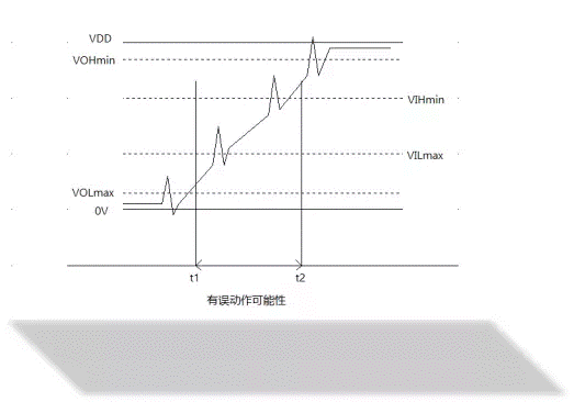 因?yàn)閿?shù)字信號緩慢上升或下降時(shí),。如下圖所示,由于t1-t2的上升時(shí)間變緩,就降低了噪聲容限,出現(xiàn)誤動作的可能性大大增加。信號在變化的中段,特別時(shí)閾值附近(VILmax-VIHmin附近)的噪聲容限最低,因此在信號上疊加的噪聲即使很小也會造成誤動作。