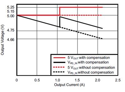 一個常見的解決方案就是盡可能地將典型值為5.0V的無負載輸出設(shè)定電壓提高到5.15V至5.20V(對于USB 3.0來說,最大值為5.25V)。這個解決方案在最大2.1A電流時提供足夠(雖然仍舊為最小值)凈空。而對于更高的負載電流,這個方法很快就會難以支撐。