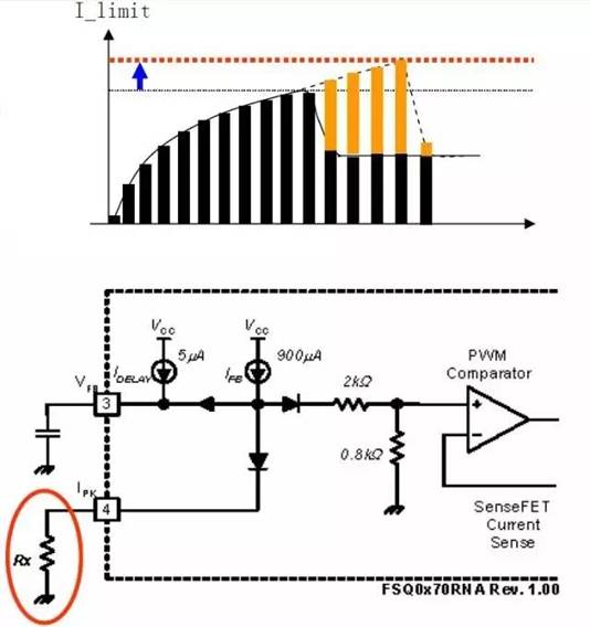 1)增大峰值電流限流點(diǎn)I_limit,可允許流過更大電感電流Id:將與Pin4相接的電阻增大,從內(nèi)部電流源Ifb分流更小,使作為電流限制參考電壓的PWM比較器正輸入端的電壓將上升,即允許更大的電流通過MOSFET/變壓器,可以提供更大的能量。