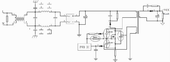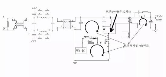 由1-1和1-2式可知,寄生電感和di/dt形成電壓尖峰,寄生電容和dv/dt形成電流尖峰。這些快速變化的電流和關(guān)聯(lián)的諧波在其他地方產(chǎn)生耦合的噪聲電壓,因此影響到開關(guān)電源EMI特性。下面以反激式開關(guān)拓?fù)錇槔瑢档蚆OSFET的dv/dt和di/dt措施進(jìn)行介紹。