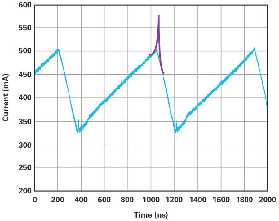 圖3. 電感電流的測(cè)量結(jié)果顯示為藍(lán)色,飽和電感的行為顯示為附加的紫色。