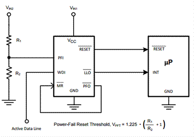通常來講,受到連接到主電源的分壓器的驅(qū)動,電源失效比較器指示電源不斷下降。在主電源電壓下降到低于復(fù)位閾值之前,PFI的電壓低于VPFT幾毫秒,其會提前發(fā)出欠壓警報(bào)。 PFI引腳還可連接到MR引腳,以強(qiáng)制用于電壓檢測器的低輸出信號或用于監(jiān)控器/復(fù)位IC的復(fù)位。