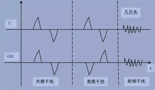 經(jīng)常在實(shí)際操作中,對(duì)系統(tǒng)損傷很大的都是低頻的共模干擾,譬如大功率電機(jī)、斷路器或開關(guān),短路,雷擊感應(yīng)等。這些類型大都是外來的共模信號(hào),其脈寬在數(shù)百us到s之間,周期很長(zhǎng)也是數(shù)秒,這樣的脈沖持續(xù)引起對(duì)地的高電壓波動(dòng),從而損傷系統(tǒng)。但是對(duì)于高頻共模干擾,從干擾源開始,大部分能量是以輻射的方式作為能量傳輸途徑的,而且這樣的共模干擾多產(chǎn)生于系統(tǒng)本身。