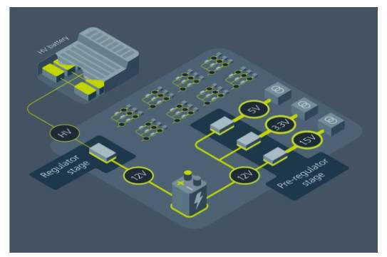 這種傳統(tǒng)架構(gòu)起源于汽車配備交流發(fā)電機(jī)的時(shí)代,交流發(fā)電機(jī)是一種敏感的 12V PDN,需要穩(wěn)壓才能為電池充電,在啟動(dòng)事件中保持無線電工作,或讓車的白熾大燈保持適當(dāng)亮度。OEM 廠商非常有創(chuàng)意地繞過了 12V 電源限制,近年來設(shè)計(jì)了兩款 12V 電池,一款用于動(dòng)力轉(zhuǎn)向的 24V 電池以及其間的幾款 DC-DC 轉(zhuǎn)換器。