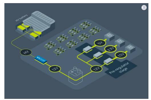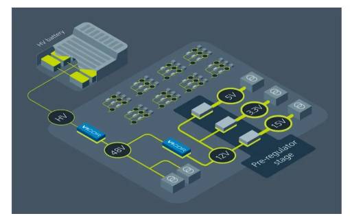 圖 2:優(yōu)化的 E/E 架構(gòu)可取消 12V 的物理電池。使用 Vicor BCM 母線轉(zhuǎn)換器技術(shù)轉(zhuǎn)化高壓電池,可創(chuàng)建虛擬 12V 電池。