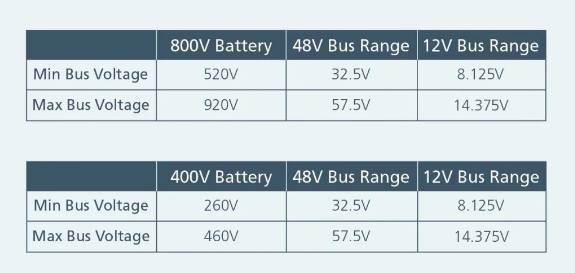 表 1:采用 Vicor BCM/NBM 母線轉(zhuǎn)換器技術(shù)的 48V 母線和 12V 母線上的最小電壓和最大電壓。48V 和 12V 電壓范圍均符合 VDA 320 和 LV 124 標(biāo)準(zhǔn)。
