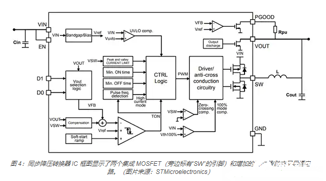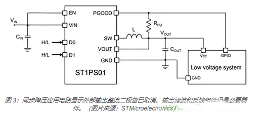 在同步降壓轉(zhuǎn)換器中,如 STMicroelectronics 推出的 ST1PS01 使用同步 MOSFET 整流取代了輸出整流器(圖 3)。相比異步降壓轉(zhuǎn)換器中的輸出整流器,同步 MOSFET 的“導(dǎo)通”電阻較低,可降低損耗,從而顯著提高轉(zhuǎn)換效率。同步 MOSFET 是該 IC 的內(nèi)部組成部分,不需要外部整流二極管
