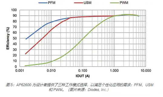 AP62600 提供了三種操作模式供設(shè)計者選擇,以滿足個性化應(yīng)用的具體需求(圖 5)。通過脈沖調(diào)頻 (PFM) 操作,可以實現(xiàn)所有負載的高效率。其他可用的模式包括可以獲得最佳紋波性能的脈寬調(diào)制 (PWM),以及可避免輕載時產(chǎn)生可聞噪聲的超聲波模式 (USM)。