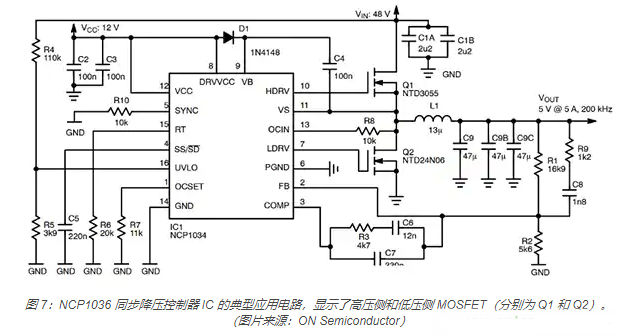 ON Semiconductor 的 NCP1034DR2G 是一款高壓 PWM 控制器,針對輸入電壓高達 100 伏的高性能同步降壓 DC/DC 應(yīng)用。該器件設(shè)計用于嵌入式電信、網(wǎng)絡(luò)和計算應(yīng)用中的 48 伏非隔離電源轉(zhuǎn)換。NCP1034 驅(qū)動一對外部 N 溝道 MOSFET,如圖 7 所示。