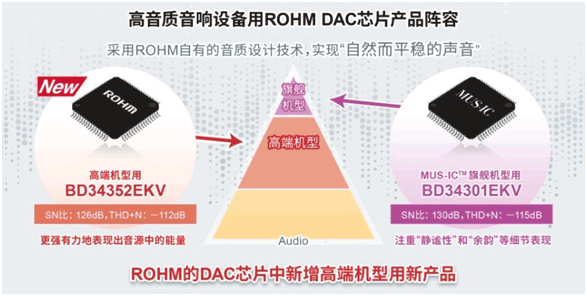 通常認(rèn)為,DAC芯片是決定音響設(shè)備音質(zhì)的最重要器件之一,因?yàn)樾枰獜母叻直媛蕯?shù)字音源數(shù)據(jù)中更大程度地提取信息并將其轉(zhuǎn)換為模擬信號。一直以來,ROHM的音頻產(chǎn)品開發(fā)都非常注重音質(zhì)。例如,基于50年來的音頻IC產(chǎn)品開發(fā)經(jīng)驗(yàn),建立了可充分提取音源信息的“音質(zhì)設(shè)計(jì)技術(shù)”,并推出了高音質(zhì)的聲音處理器IC和高音質(zhì)的音響電源IC等。其中,作為旗艦機(jī)型開發(fā)的“MUS-IC™”系列中的DAC芯片“BD34301EKV”,其音質(zhì)效果獲得高度好評,目前已在世界范圍內(nèi)被廣泛應(yīng)用?蛻魧τ诳捎糜诟鼜V泛的音響設(shè)備的高端機(jī)型用DAC芯片的需求不斷增加,為滿足客戶需求,ROHM此次又開發(fā)出“BD34352EKV”。