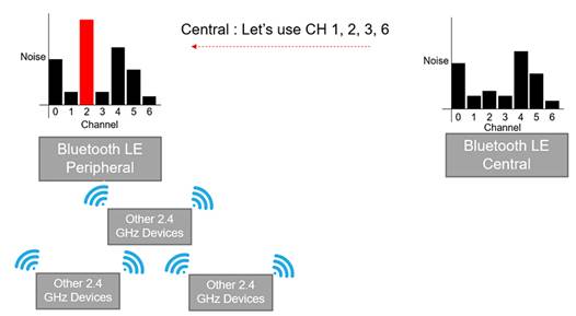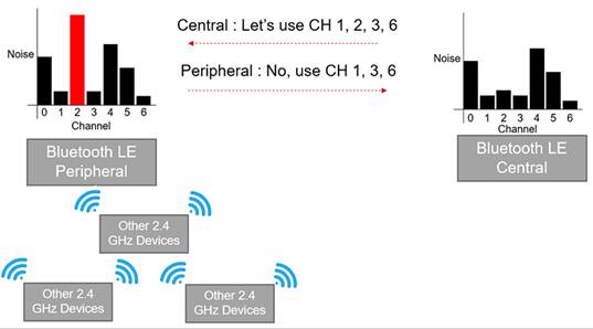 隨著將編碼 PHY 引入BLE,BLE 連接可以覆蓋的距離急劇增加。以電子貨架標簽為例。只有中心設(shè)備由于標簽被放置在整個零售空間中,因此控制頻譜空間的意義不大。從一個外圍設(shè)備的位置到另一個位置,通道條件可能會有很大差異,但這些都不會反映在通道映射中,通道映射是由中央單獨設(shè)置的。