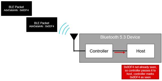 現(xiàn)在,在周期性廣告中,發(fā)送設(shè)備可以在它們發(fā)送的數(shù)據(jù)包中包含一個AdvDataInfo 字段,以允許接收設(shè)備檢查它們之前是否已經(jīng)收到過這個數(shù)據(jù)包。如果是這樣,設(shè)備將停止接收,從而節(jié)省無線電的功耗。這種做法還可以讓設(shè)備避免將冗余數(shù)據(jù)包傳遞給主機。通過過濾傳遞給主機的內(nèi)容,低功耗設(shè)備可以通過忽略冗余數(shù)據(jù)包來節(jié)省更多能源。