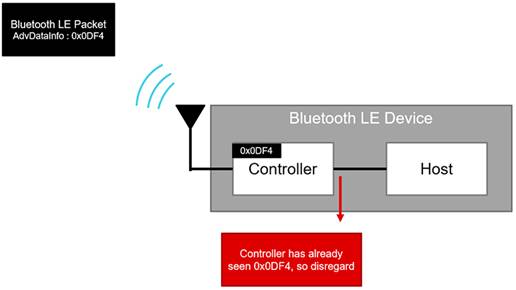 使用周期性廣告的BLE設(shè)備通常會多次發(fā)送信息,以增加傳輸?shù)亩鄻有圆⑻岣邟呙柙O(shè)備正確解碼的可能性。因此,偵聽器設(shè)備可能會接收到同一分組的多個副本,并且會浪費功率多次解碼同一信息。