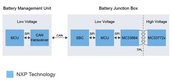 高壓系統(tǒng)通信的一個(gè)挑戰(zhàn)是將低壓半導(dǎo)體 (12 V) 與高壓 (400 V) 電池側(cè)隔離開(kāi)來(lái)。在這里,BMU(電池管理單元) 的通信傳統(tǒng)上是通過(guò) CAN 總線(xiàn)進(jìn)行的,但通過(guò)變壓器物理層 (TPL) 以菊花鏈方式連接 BJB 是一種有吸引力的替代方案。TPL 接口專(zhuān)為 BMS 設(shè)計(jì),支持高達(dá) 2kV 的高隔離電壓。這種解決方案的好處包括更強(qiáng)大的電磁兼容性 (EMC) 特性、更高的高壓隔離、更好的通信速度和同步測(cè)量。從而降低了軟件相關(guān)的復(fù)雜性并降低了 BOM 成本。