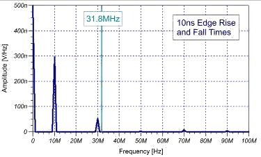 10 ns 邊緣率時(shí)方程式結(jié)果為約 31.8 MHz。曲線(xiàn)圖顯示,最后一次明顯諧波出現(xiàn)在30 MHz。同時(shí),圖 2 所示 1 ns 邊緣率時(shí)方程式結(jié)果為 318 MHz 最大頻率。如果您的電路易受 318 MHz 頻帶內(nèi)產(chǎn)生的頻率影響,則 EMI 諧波可能會(huì)使您的電路出現(xiàn)干擾。