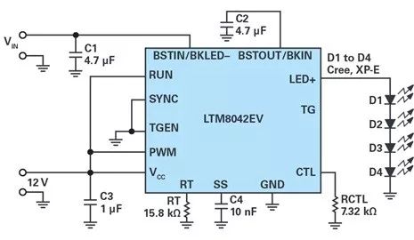 圖1. LTM8042驅(qū)動四個LED,其中 VIN = 5.75 V 至 10.25 V and IOUT = 0.5 A