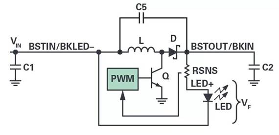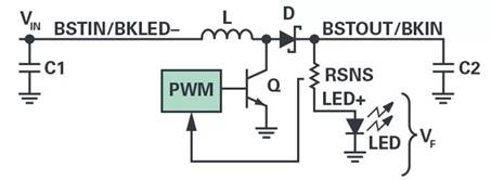 降壓拓撲用于相對較高的輸入電壓,如汽車和工業(yè)24 V電源軌。圖3顯示了 VIN > VF配置的方框圖。輸入電壓連接到BSTOUT/BKIN終端,LED陰極連接到BSTIN/BKLED–終端。當(dāng)晶體管Q導(dǎo)通時,電流從輸入端流過LED燈串和電感L直到GND。一旦Q關(guān)斷,L上的電壓就會改變極性,二極管D會正偏,從而將LED陰極拉到輸入電壓電平以下,在LED燈串中提供設(shè)定的電流值。C5為該拓撲創(chuàng)建輸出濾波器。