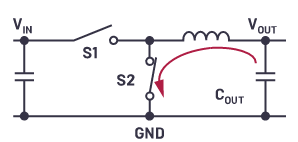 雖然簡(jiǎn)單電壓轉(zhuǎn)換器可以從輸入電壓生成固定的輸出電壓,但在某些應(yīng)用中,這種特性是不夠的。一個(gè)例子是控制與電容相連的電壓節(jié)點(diǎn),這些電容可以充電至任何電壓。如果需要降低其電壓,則其必須部分放電。因此,在這樣的應(yīng)用中,電源必須能夠根據(jù)需要提供或吸收電流。這種轉(zhuǎn)換器稱為四象限D(zhuǎn)C-DC轉(zhuǎn)換器。對(duì)于這樣的應(yīng)用,可以使用具有輸出放電功能的電源。它可以讓輸出電容快速放電。圖1顯示了降壓型開關(guān)穩(wěn)壓器的這種功能。這里,在降壓轉(zhuǎn)換器關(guān)閉之后,開關(guān)S2長(zhǎng)時(shí)間接通,輸出電容被放電。