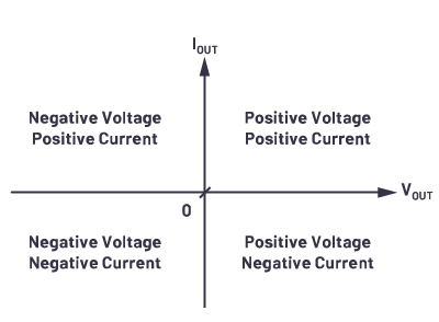 圖2顯示了四象限對(duì)于電源的含義。在坐標(biāo)系的象限中,x軸表示電壓,y軸表示電流。電流和電壓可以為正或?yàn)樨?fù)。