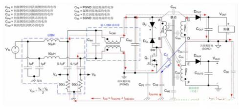 噪聲電流傳播路徑。同時,還顯示了初級側基準的輔助輸出端