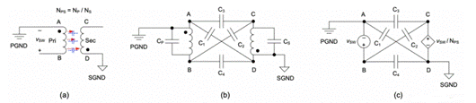 所示為雙繞組變壓器,初級側端子和次級側端子分別由(A、B)和(C、D)表示。端子 A 根據輸入總線電容等效連接到 PGND,在 CM