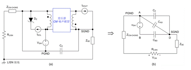 噪聲電流主要傳播路徑。電容 CZ從初級側接地端 (PGND) 連接到次級側接地端 (SGND),將次級側的 CM 電流分流回初級側,其作用是分流流經