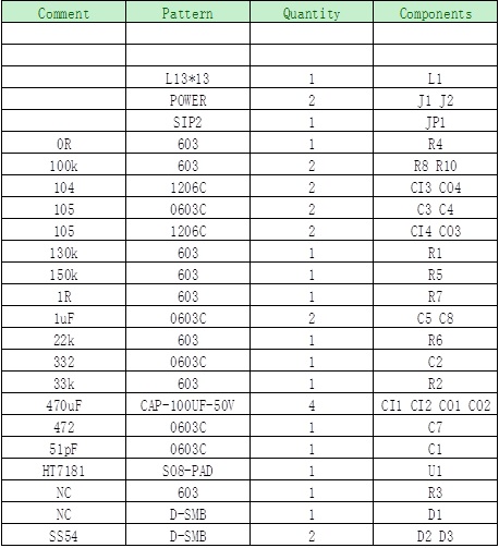 HT7181應用于單節(jié)鋰電池升壓、雙節(jié)鋰電池升壓、三節(jié)鋰電池升壓典型參數(shù)如下:
