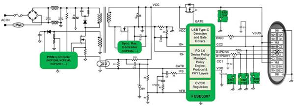 FUSB3307 設(shè)計用于支持 AC/DC 和 DC/DC 充電器,可提供適合 PD 電源的全套響應(yīng)。因此,設(shè)計人員可以用 FUSB3307 和相對較少的其它設(shè)備、元件實現(xiàn)一個兼容 USB-C PD 3.0 的電源。