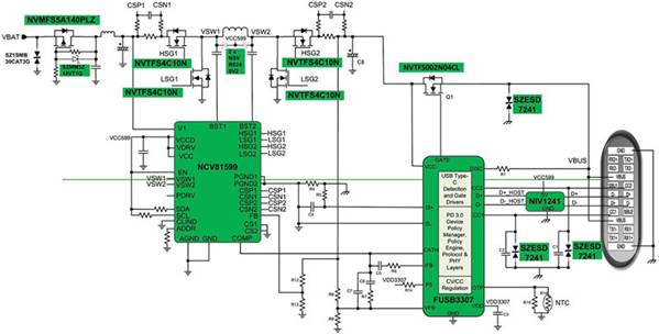 圖 2:在車載充電器的 DC/DC 充電器設(shè)計中,F(xiàn)USB3307 直接控制 DC/DC 控制器的電壓輸出,根據(jù)諸如 5G 手機或其他移動設(shè)備等灌入設(shè)備的指令提高或降低輸出。(圖片來源:ON Semiconductor)