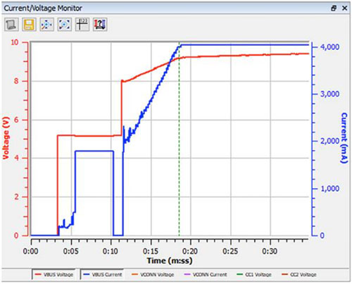 在本演示中,評估板和手機連接后,5G 手機選擇基準(zhǔn) PDO(5.00 V,最大 5.00 A),如圖中前 10 秒所示。在這個階段,充電電壓 (VBUS) 為 5 V,5G 手機的充電電流 (IBUS) 約 2 A。然后,5G 手機請求更高的 PDO,聲明該充電器能夠在 4 A 條件下提供 8 V 電壓。FUSB3307 響應(yīng)請求并立即更改:VBUS 按要求跳到 8 V,IBUS 表現(xiàn)為逐漸增大,因為 5G 手機提高了 IBUS 電流。
