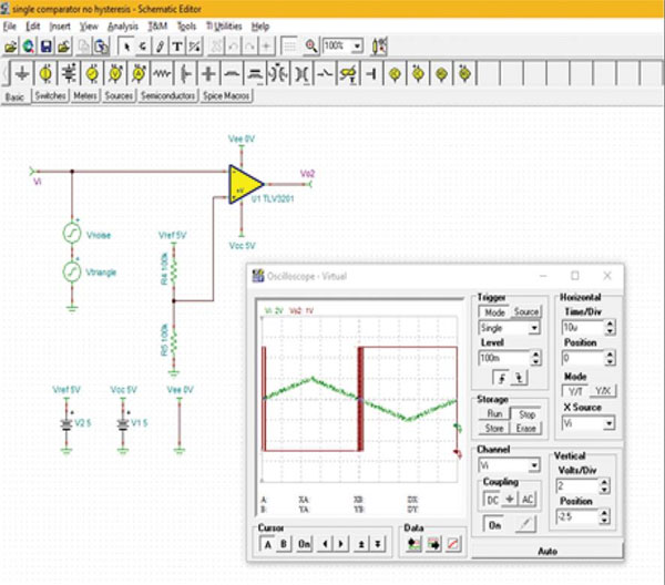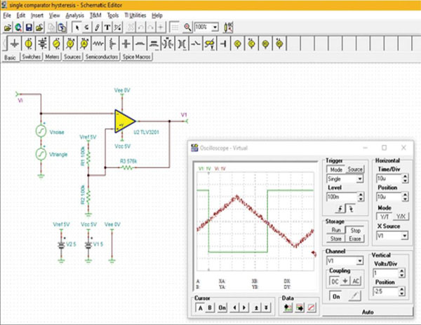 圖 1:TINA-TI 仿真說明了比較器的基本工作原理:在比較器的同相輸入端施加正弦波,而反相輸入端連接參考零伏(地)。(圖片來源:Digi-Key Electronics)
