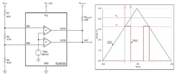 所示窗口電路采用了 Texas Instruments 的 TLV6710DDCR 雙電壓比較器。TLV6710 包含兩個用于高電壓應用的高精度比較器。供電電壓可以在 1.8 至 36 伏之間。該器件包含一個 400 mV 內部 DC 參考源。如圖所示,比較器輸出采用開漏連接,可以通過一個公共上拉電阻將其輸出連接在一起,進行邏輯“或”運算。比較器已接線,以便將參考電壓施加到其中一個比較器(比較器 A)的反相輸入端,非反向輸入施加到另一個比較器(比較器 B)。通過由電阻 R1、R2 和 R3 組成的分壓器施加輸入電壓,分壓器將下限閾值電壓設置為 3.3 伏,上限閾值電壓設置為 4.1 伏。當輸入 VMON 在窗口內時,比較器輸出為高電平(3.3 伏)。比較器 A 指示輸入電壓低于 4.1 伏,比較器 B 指示輸入電壓超過 3.3 伏。TLV6710 的內部額定電壓遲滯為 5.5 mV,有助于抑制噪聲和小毛刺。