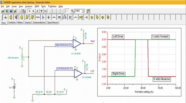 窗口可用于機器人技術,通過光線和兩個 CDS 光電管來控制機器人的移動方向。例如,硫化鎘 (CDS) 光電池在燈光下會改變電阻,黑暗環(huán)境下電阻較高而燈光下則電阻較小。TINA-TI 仿真使用 Texas Instruments LM393BIPWR 雙比較器說明了這一原理(圖 5)。