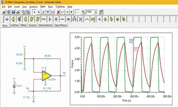 最大振蕩頻率受比較器傳播延遲的限制。本例中,采用具有 40 ns 傳播延遲的 Texas Instruments TLV3201 用于構建 10 MHz 振蕩器。該頻率非常接近該比較器的最大值。