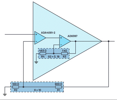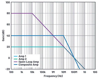 但是,您可以使用兩個單獨的放大器來構(gòu)建這種放大器,形成復合放大器。將兩個運算放大器組合在一起,就能將各自的優(yōu)勢特性集成于一體。這樣,與具有相同增益的單個放大器相比,兩個運算放大器組合可以實現(xiàn)更高的帶寬。
