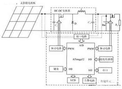 電壓檢測電路用于識(shí)別光照的強(qiáng)度和獲取蓄電池端電壓。溫度檢測電路用于蓄電池充電溫度補(bǔ)償。該系統(tǒng)采用PWM方式驅(qū)動(dòng)充電電路,控制蓄電池的最優(yōu)充放電。電池板分組切換控制電路用于不同光強(qiáng)度和充電模式下電池板的切換,該系統(tǒng)實(shí)現(xiàn)對(duì)3組電池板陣列控制。負(fù)載電流檢測電路用于過流保護(hù)及負(fù)載功率檢測。狀態(tài)顯示電路用于系統(tǒng)狀態(tài)的顯示,包括電壓、負(fù)載狀況及充放電狀態(tài)的顯示。串行口上傳數(shù)據(jù)電路用于系統(tǒng)運(yùn)行參數(shù)的上傳,實(shí)現(xiàn)遠(yuǎn)程監(jiān)控。鍵盤輸入電路用于充電模式設(shè)定及LCD背光開啟。該控制器在有陽光時(shí)接通電池板,向蓄電池充電;當(dāng)夜晚或陰天陽光不足時(shí),蓄電池放電,以保證負(fù)載不停電。
