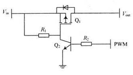 設(shè)計(jì)的控制器屬于串聯(lián)型,即控制充電的開關(guān)是串聯(lián)在電池板與蓄電池之間的。串聯(lián)型控制器相對(duì)于并聯(lián)型控制器能夠更有效地利用太陽能,減少系統(tǒng)的發(fā)熱量。設(shè)計(jì)中用MOSFET實(shí)現(xiàn)開關(guān)。MOSFET是電壓控制單極性金屬氧化物半導(dǎo)體場效應(yīng)晶體管,所需驅(qū)動(dòng)功率較小。而且MOSFET只有多數(shù)載流子參與導(dǎo)電,不存在少數(shù)載流子的復(fù)合時(shí)間,因而開關(guān)頻率可以很高,特別適合作為PWM控制充電開關(guān)。為此,設(shè)計(jì)中采用P溝道MOSFET。P溝道MOSFET的導(dǎo)通電壓Vth<0,由圖4可以實(shí)現(xiàn)MOSFET的驅(qū)動(dòng)。當(dāng)Q2導(dǎo)通時(shí),由于Q2的Vce很小,可以認(rèn)為Q1的G極接地,Vgs<0,當(dāng)Vin達(dá)到一定值時(shí),Q1導(dǎo)通。