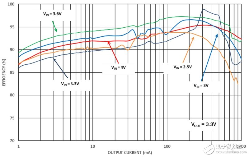 首先,我們將討論升壓-降壓穩(wěn)壓器如何為可穿戴系統(tǒng)增加價(jià)值。對(duì)于需要約3.3V~3.6V輸入電壓的應(yīng)用,升壓-降壓穩(wěn)壓器可高效地使用電壓范圍為4.375V~2.5V的廣泛新型化學(xué)電池。升壓-降壓穩(wěn)壓器在電池電壓(Vbat)為2.5V~3V時(shí)處于純升壓模式,然后在Vin≥3V和<3.9V時(shí)處于升壓-降壓模式,最后在Vbat =3.9V-4.5V時(shí)處于純降壓模式。