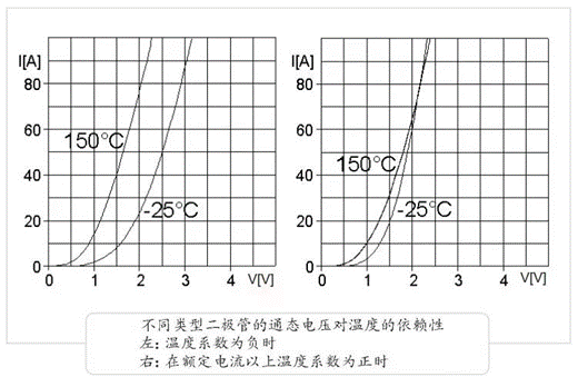 判斷一個二極管是否適合并聯的重要參數是其通態(tài)電壓對溫度的依賴性。如果通態(tài)電壓隨溫度的增加而下降,則它具有負的溫度系數。對于損耗來說,這是一個優(yōu)點。