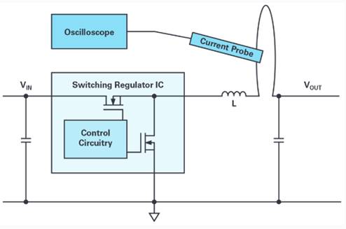 圖1以典型的降壓型轉(zhuǎn)換器(降壓拓?fù)洌槔,顯示了針對(duì)這類測量的建議設(shè)置。接入一根輔助小電纜與電感串聯(lián)。將它用來連接一個(gè)電流探頭,并通過示波器顯示電感電流。建議在電感具有穩(wěn)定電壓的那一側(cè)進(jìn)行測量。