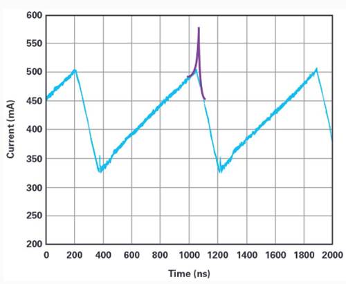 圖3. 電感電流的測量結(jié)果顯示為藍(lán)色,飽和電感的行為顯示為附加的紫色。
