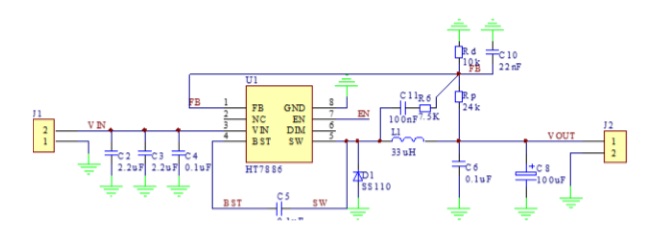 (3)使用電解電容 使用電解電容器時(shí),正向電阻、電容(C11 和 R6)改為 FB 連接到 SW,如下 圖所示。需要注意的是,該種連接方式的動(dòng)態(tài)響應(yīng)會(huì)變慢。