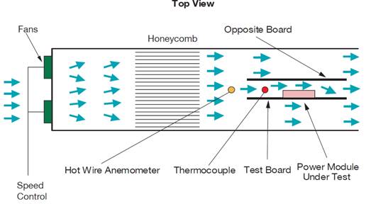 進(jìn)行測(cè)試的目的是要使用特定區(qū)域的測(cè)試電路板,使其成為可再現(xiàn)的代表性案例,該指定區(qū)域具有指定數(shù)量和厚度的銅層,具體取決于被評(píng)估的轉(zhuǎn)換器功率水平。圖中所示的“對(duì)向”板對(duì)于嘗試更接近地再現(xiàn)真實(shí)機(jī)架環(huán)境,以及如何影響靠近電源模塊的氣流方向和湍流都非常重要。為了快速獲得結(jié)果,測(cè)量是在本地環(huán)境溫度下進(jìn)行,通常比室內(nèi)溫度高幾度,然后監(jiān)控轉(zhuǎn)換器上指定關(guān)鍵組件的熱區(qū)溫度,以及靠近測(cè)試板的特定氣流。在選定氣流速率、標(biāo)稱輸入電壓和負(fù)載電流下,測(cè)量熱區(qū)和本地環(huán)境溫度之間的差異以給出溫升,然后將其外推為在溫度超過(guò)關(guān)鍵組件要求之前給出的最高本地環(huán)境溫度,從而得到器件降額特性曲線。