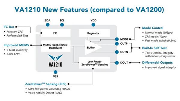 據(jù)麥姆斯咨詢(xún)介紹,隨著Vesper的第二代智能壓電語(yǔ)音加速度計(jì)“VA1210”的發(fā)布,Vesper繼續(xù)重新定義其語(yǔ)音應(yīng)用的MEMS解決方案的范圍。VA1210在語(yǔ)音拾取方面比第一代VA1200提供更高的靈敏度(+17 dB)和更高的(+6 dB)SNR。此外,VA1210引入了語(yǔ)音喚醒(WoV)和硬件語(yǔ)音活動(dòng)檢測(cè)(HVAD)的新功能,可以大幅提高真無(wú)線(xiàn)立體聲(TWS)耳機(jī)的語(yǔ)音質(zhì)量。